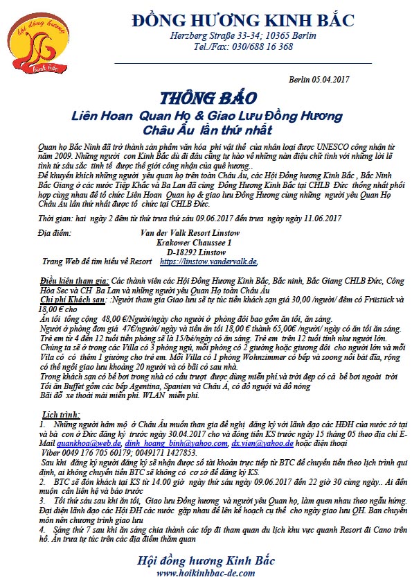 HĐH Kinh Bắc Mời tham dự Liên hoan Quan họ và giao lưu đồng hương 09/04/2017 | | 5.027 Recommended for You TỶ PHÚ ĐỐI ĐẦU VỚI NHÀ BÁO LẦN THỨ BA Việt Nam yêu cầu Đức cấm tờ Thoibao.de Việt Nam phản ứng về về việc Bộ Ngoại giao Đức lên án đàn áp xuyên quốc gia Phạm Nhật Vượng lại một lần nữa thảm bại tại tòa án Đức Kêu gọi Bắt cóc? Thực tập sinh Việt Nam bị bóc lột như thế nào Tỷ phú giàu nhất Việt Nam thua kiện một nhà báo tự do – Trận so găng giữa tiền và tự do ở Berlin Tỷ phú kiện nhà báo PHẠM NHẬT VƯỢNG RA TÒA TẠI ĐỨC! CHẤN ĐỘNG: PHẠM NHẬT VƯỢNG BỊ TÒA ÁN ĐỨC TRIỆU TẬP! TÌNH HÌNH XUẤT KHẨU NGƯỜI VIỆT NAM SANG ĐỨC HỌC NGHỀ: NHIỀU NGƯỜI BỖNG NHIÊN BIẾN MẤT! Bộ Quốc Phòng – “Lính Canh Tự Do Ngôn Luận”, Quên Cả Tổ Quốc Bỉ và Việt Nam cách nhau bao xa, trong những khía cạnh khác nhau? AN NINH CSVN THEO TÔI ĐẾN TẬN MỸ Cháy lớn tại Chợ Sapa của người Việt ở Séc Về Nguyễn Thị Thanh Nhàn