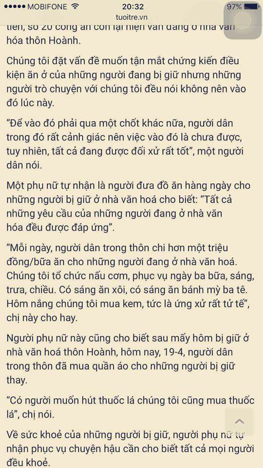 Người phụ nữ này cũng cho biết sau mấy hôm bị giữ ở nhà văn hoá thôn Hoành, hôm nay, 19-4, người dân trong thôn đã mua quần áo cho những người bị giữ thay.
