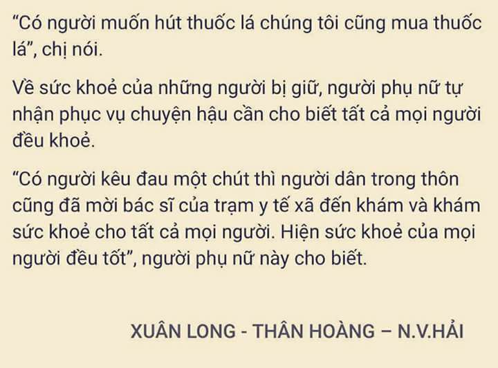 “Mỗi ngày, người dân trong thôn chi hơn một triệu đồng/bữa ăn cho những người đang ở nhà văn hoá. Chúng tôi tổ chức nấu cơm, phục vụ ngày ba bữa, sáng, trưa, chiều. Có sáng ăn xôi, có sáng ăn bánh mỳ ba tê. Hôm nắng chúng tôi mua kem, tức là ứng xử rất tử tế”, chị này cho hay.
