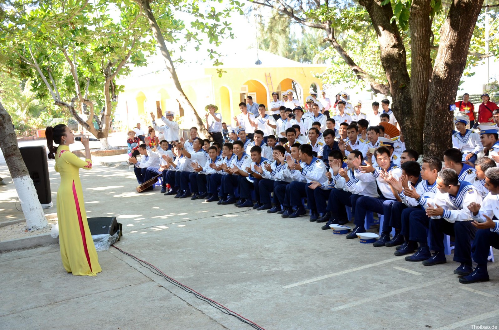 Các chiến sĩ trẻ vui vẻ xem văn công biểu diễn trên đảo