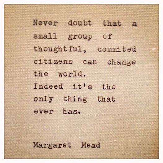 Đây là một câu quote mình biết gần đây và cảm thấy rất thích. Dịch ý của nó đó là „đừng bao giờ hoài nghi rằng một nhóm cá nhân với sự quyết tâm và nghĩ suy thấu đáo có thể thay đổi thế giới này. Thực tế, mọi thay đổi đều bắt nguồn từ những nhóm người như vậy.“