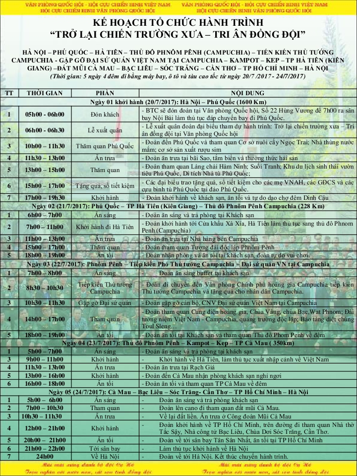 Nằm trong khuôn khổ các hoạt động của chương trình „ Tri ân đồng đội 2017 „ với hành trình „ Trở lại chiến trường xưa – Tri ân đồng đội „ Ban tổ chức sẽ mời các đại biểu trực tiếp trao tặng những phần quà, sổ tiết kiệm tình nghĩa tới các mẹ Việt Nam anh hùng, gia đình liệt sỹ, thương binh, cựu chiến binh có hoàn cảnh khó khăn thông qua hành trình „ Trở lại chiến trường xưa , tri ân đồng đội 20.07.2017 – 24.7.2017 „: Hà Nội – Nhà tù Phú Quốc – Thủ đô Phnôm Pênh ( Campuchia ) – Tiếp kiến Thủ tướng Campuchia – Gặp gỡ Đại sứ quán Việt Nam tại Campuchia – Đất mũi Cà Mau – Kiên Giang – Bạc Liêu – Sóc Trăng – Cần Thơ – Dinh Độc lập ( T.P Hồ Chí Minh ). Tư liệu về hành trình đầy ý nghĩa này sẽ được phát trong phóng sự tại chương trình truyền hình trực tiếp Tri ân đồng đội.