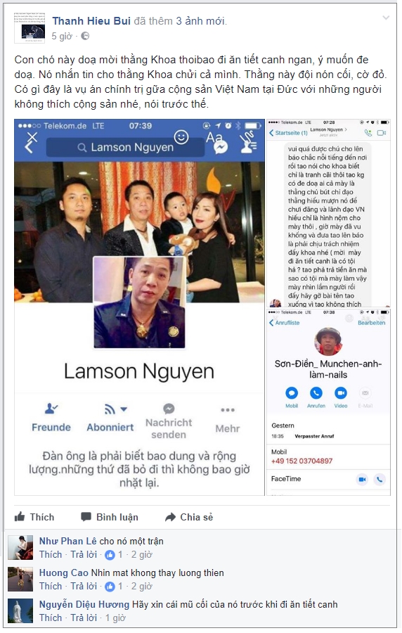 Nội dung tin nhắn đã lôi cả „ Đảng và Nhà nước VN„ cùng người khác không có liên quan vào tranh cãi cá nhân, mang đầy màu sắc vu khống Chính trị cho kiều bào ở Đức.