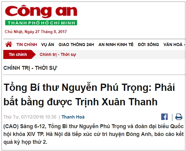 2/ Thông cáo báo chí của Tổng Công tố viên Liên bang Đức hôm 10.8.2017: Trịnh Xuân Thanh bị bắt cóc nhốt trong Đại sứ quán Việt Nam ở Berlin http://thoibao.de/tin-nuoc-duc/11336/thong-cao-bao-chi-cua-tong-cong-to-vien-lien-bang-duc—trinh-xuan-thanh-bi-bat-coc-nhot-trong-dai-su-quan-viet-nam-o-berlin.htm