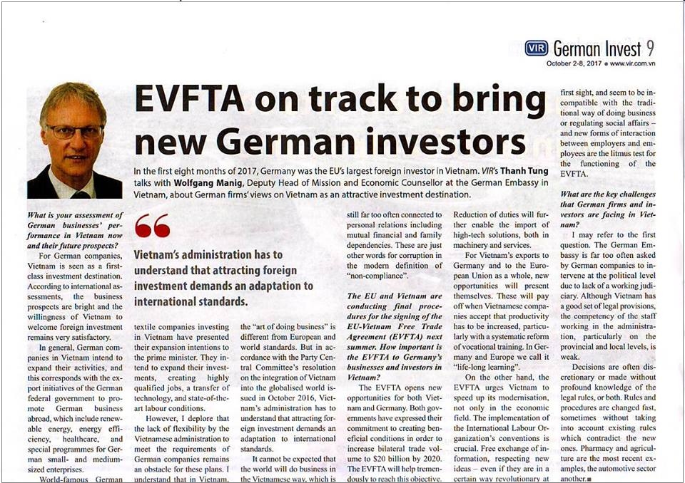 Ảnh chụp bài phỏng vấn Phó Đại sứ Đức tại Hà Nội đăng trên tờ Vietnam investment Review (ấn bản in cho tuần lễ 2./8.10.2017)