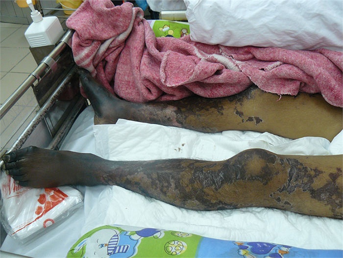 Một bệnh nhân xuất hiện nhiều vết hoại tử trên da do nhiễm liên cầu lợn