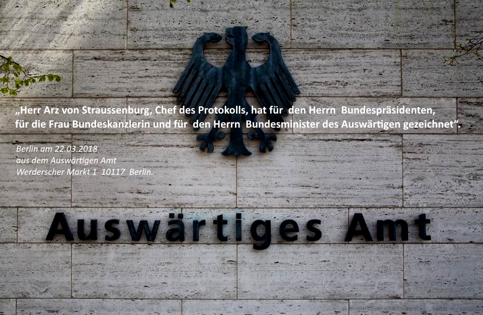 Được biết ông Arz von Straussenburg là nhân viên của Bộ Ngoại giao Đức, với chức vụ „sếp về nghi lễ ngoại giao“ ông phụ trách các việc chuẩn bị và nghi lễ tiếp đón các đoàn ngoại giao cũng như như giao tiếp với các Đại sứ quán các nước đặt trụ sở tại Đức.