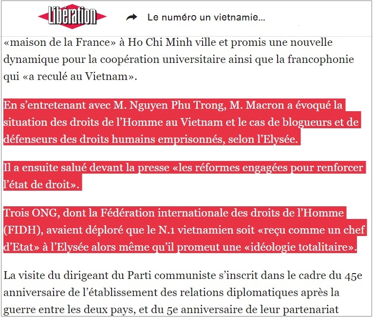 Trao đổi với ông Nguyễn Phú Trọng, ông Macron đã nói về tình hình nhân quyền tại Việt Nam và trường hợp các blogger và các nhà bảo vệ nhân quyền bị bỏ tù, Điện L’Elysée cho biết như thế.