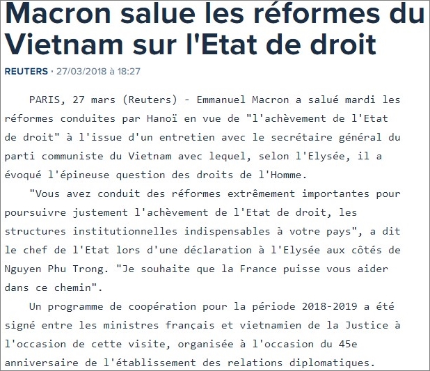 Ảnh chụp bản tin của hãng thông tấn Anh Reuters ngày 27.03.2018 với tựa đề „Ông Macron hoan nghênh những cải cách của Việt Nam về nhà nước pháp quyền“