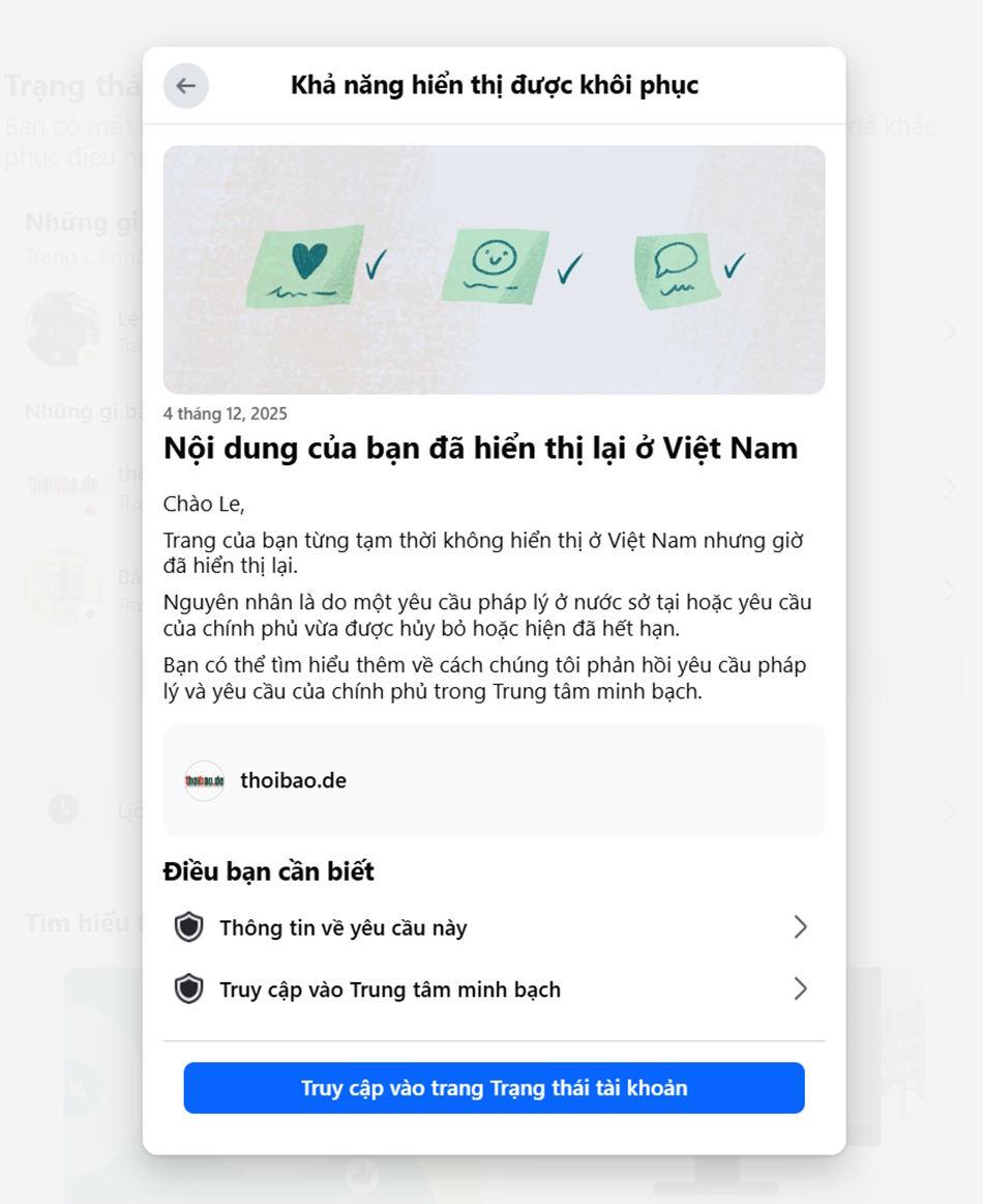 Vào tháng 12 năm 2025, Thoibao.de nhận được email từ Meta cho biết công ty có trụ sở tại Mỹ này tạm thời chặn tất cả các trang Facebook của Thoibao.de tại Việt Nam theo yêu cầu của chính quyền Hà Nội. Các phương tiện truyền thông tiếng Việt lưu vong khác cũng chịu chung số phận. Tất cả các phương tiện truyền thông trong nước Việt Nam đều chịu sự kiểm duyệt của nhà nước. Trong Chỉ số Tự do Báo chí của Phóng viên Không Biên giới, Việt Nam xếp hạng thứ 173 trên 180 quốc gia trên thế giới. Lệnh chặn này cho phép Đảng Cộng sản Việt Nam tổ chức đại hội đảng vào tháng 1 mà người dân không thể tiếp cận thông tin không bị kiểm duyệt từ nước ngoài.